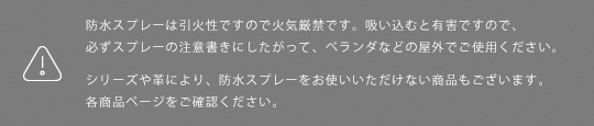 30cmほど対象から離してスプレーし、スプレーから液だれしないよう、ムラなく吹きかけてください。革はスプレー直後は色が濃くなりますが、乾くと元の色に戻ります。その後日陰で15分程乾燥させてください。艶のある革は、乾いてからクロスで軽く磨いて艶出しをしてください。
