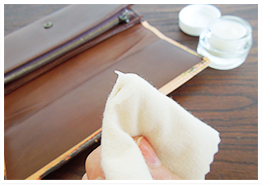 革表面の汚れを落とし、クリームを綺麗な布に少量取り、全体に満遍なく控え目に塗ります。