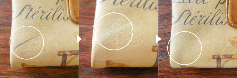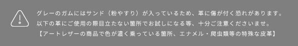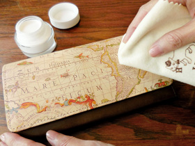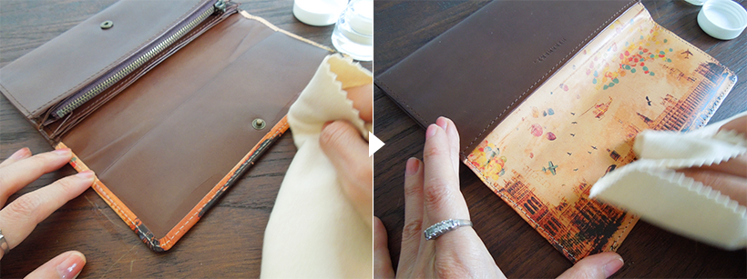 特にART LEATHERの商品は、染色されたデザインが薄くならないよう、クロスの面や革表面の様子を確認しながら、優しく行ってください。