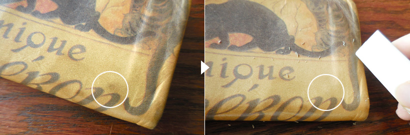コーナー部分や革表面の目立つ部分など、汚れが気になってきたら、革専用の消しゴムで汚れをスッキリ落としましょう。